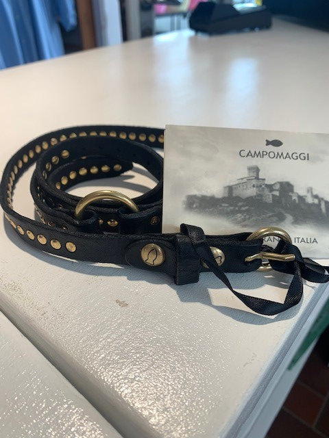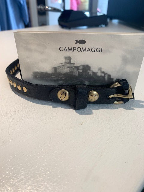 Vild KørvelCampomaggis Kura linje er et håndlavet kunstværk. Knopper erstatter syningen, hvilket skaber en unik og karakteristisk struktur. Bæltet er lavet af beklædningsfarvet naturlig okselæder med nitter, hvilket garanterer den højeste kvalitet og holdbarhed. Tilføj et unikt strejf af stil til dit look med Campomaggis Kura linje. - Spænde lukning - Guld farvet hardware - Fremstillet i Italien.
