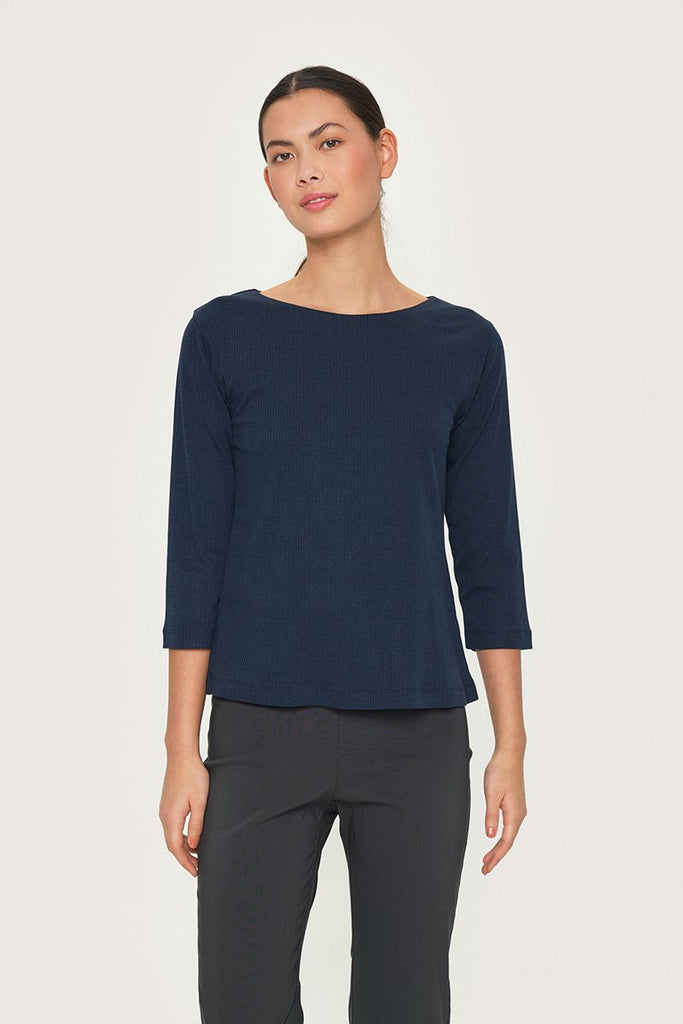 Vild KørvelRibstrikket bluse i blød jersey-kvalitet med økologisk bomuld og tilsat stretch, som får pasformen til at holde sig flot. Blusen har et enkelt udtryk, og den er oplagt at bruge til et lag-på-lag-look under en skjorte eller en transparent overdel.