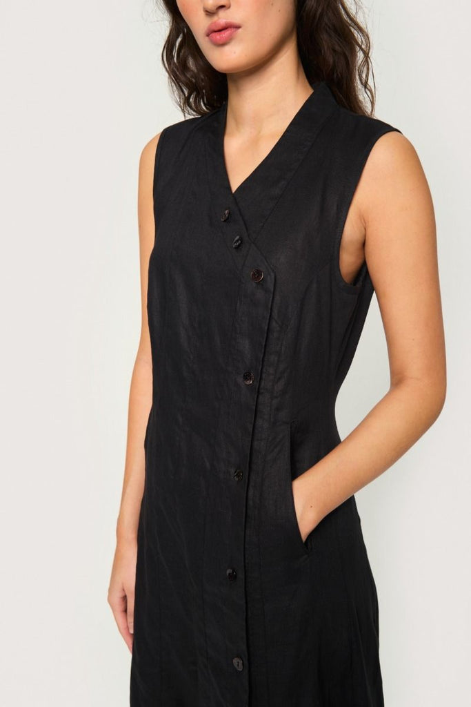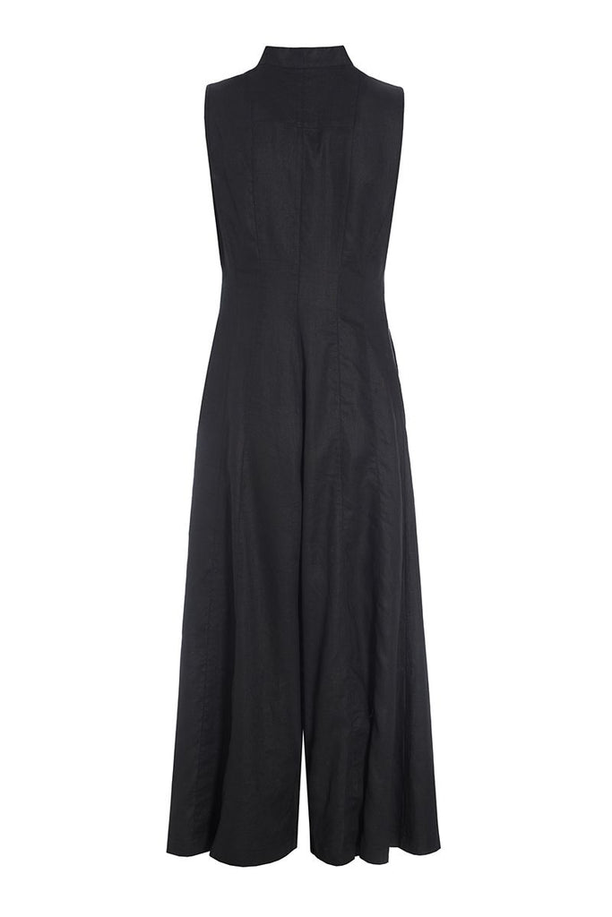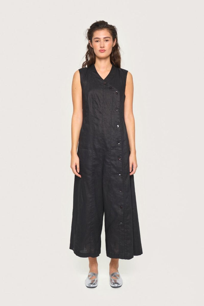 Vild KørvelEnkel buksedragt i en lækker hørkvalitet. Buksedragten har brede ben og en asymmetrisk knaplukning, som giver en flot silhuet. Et elegant alternativ til en kjole. Buksedragten kan styles på rigtig mange måder. Brug den med eller uden bluse under, tilsæt en lækker blazer, eller bær blot buksedragten i al sin enkelhed tilsat et par flotte sko.