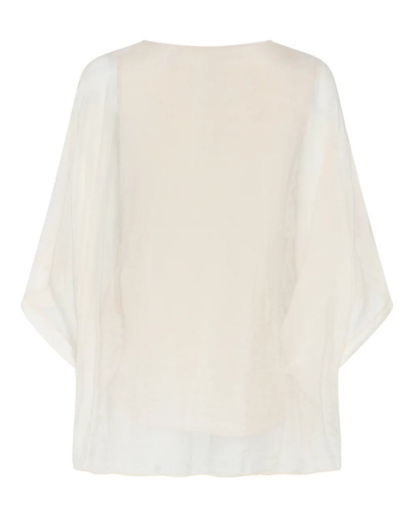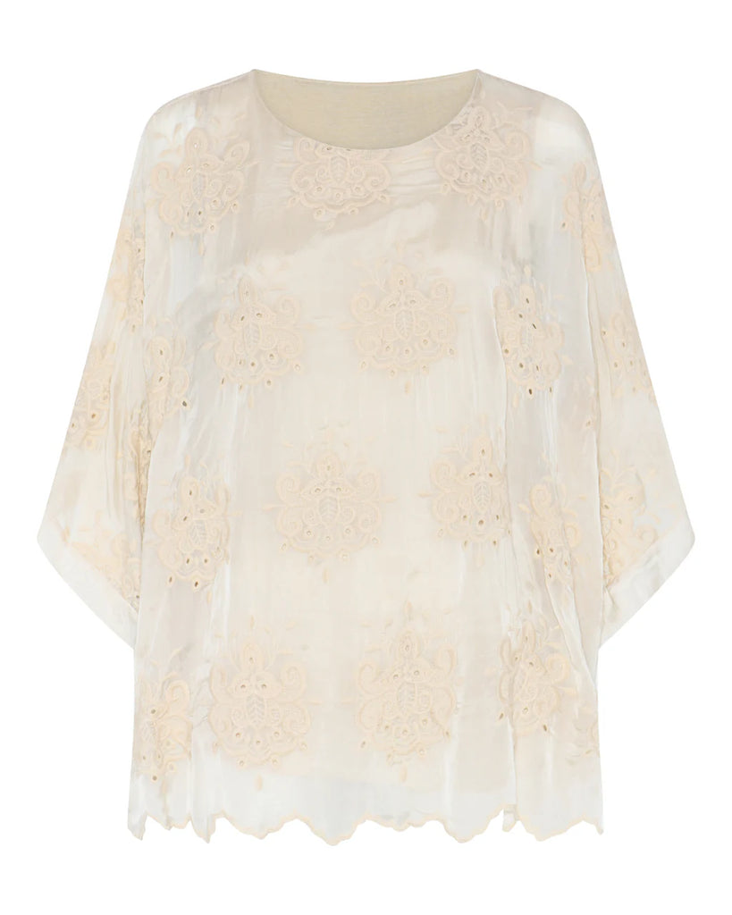 Donatella Blouse er fremstillet i en eksklusiv blanding af silke og viskose, der sikrer både komfort og holdbarhed sæson efter sæson. Blusens front prydes af smukt, detaljeret broderi, som elegant afsluttes ved blusens kant og tilføjer et raffineret præg. De rummelige ærmer giver både maksimal dækning og et luftigt, let look, hvilket gør blusen ideel til varmere dage.
