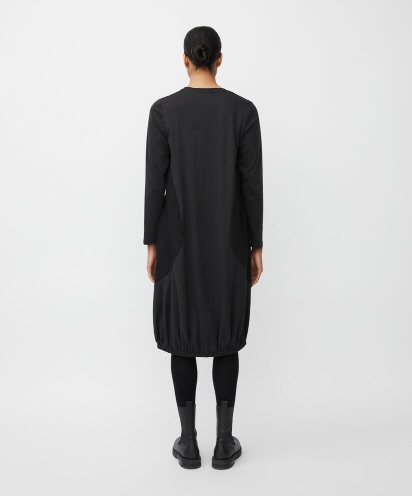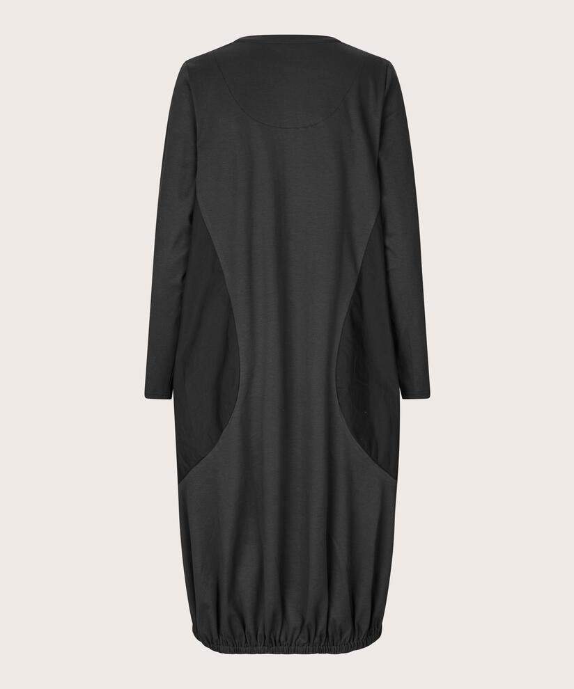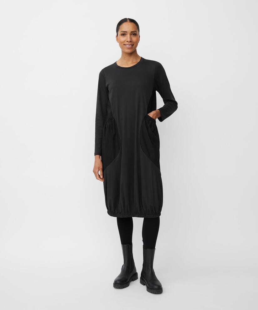Vild KørvelSkab et personligt og moderne udtryk med denne kjole i kontrastfulde materialer. Den kombinerer blødt jersey og knitrende bomuld, hvilket giver både komfort og kant. Det enkle snit med rund hals og smalle ærmer brydes elegant af de grafiske paneler i siden. Den smalle elastikkant nederst skaber en flatterende ballonform, der giver kjolen sit karakteristiske look.