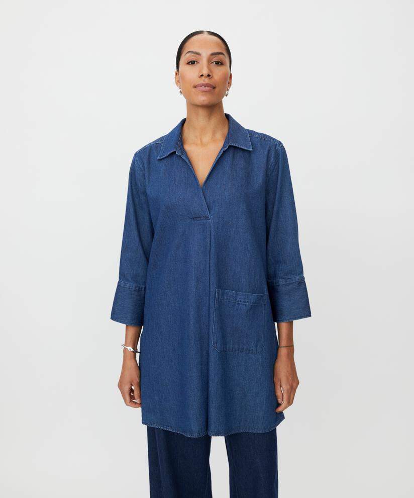 Vild KørvelEn elegant og stilfuld denimtunika, du vil gribe ud efter igen og igen. Den mørke denim føles blød mod huden og falder tungt og flot ned over kroppen. Tunikaen er designet med skjortekrave, feminin slids i halsen og dekorativ lomme foran, mens det klassiske snit med lige linjer får ekstra liv fra de fine draperinger på ryggen. Style den med smalle bukser eller leggings, og sæt et farverigt tørklæde i halsen for et personligt og feminint look.