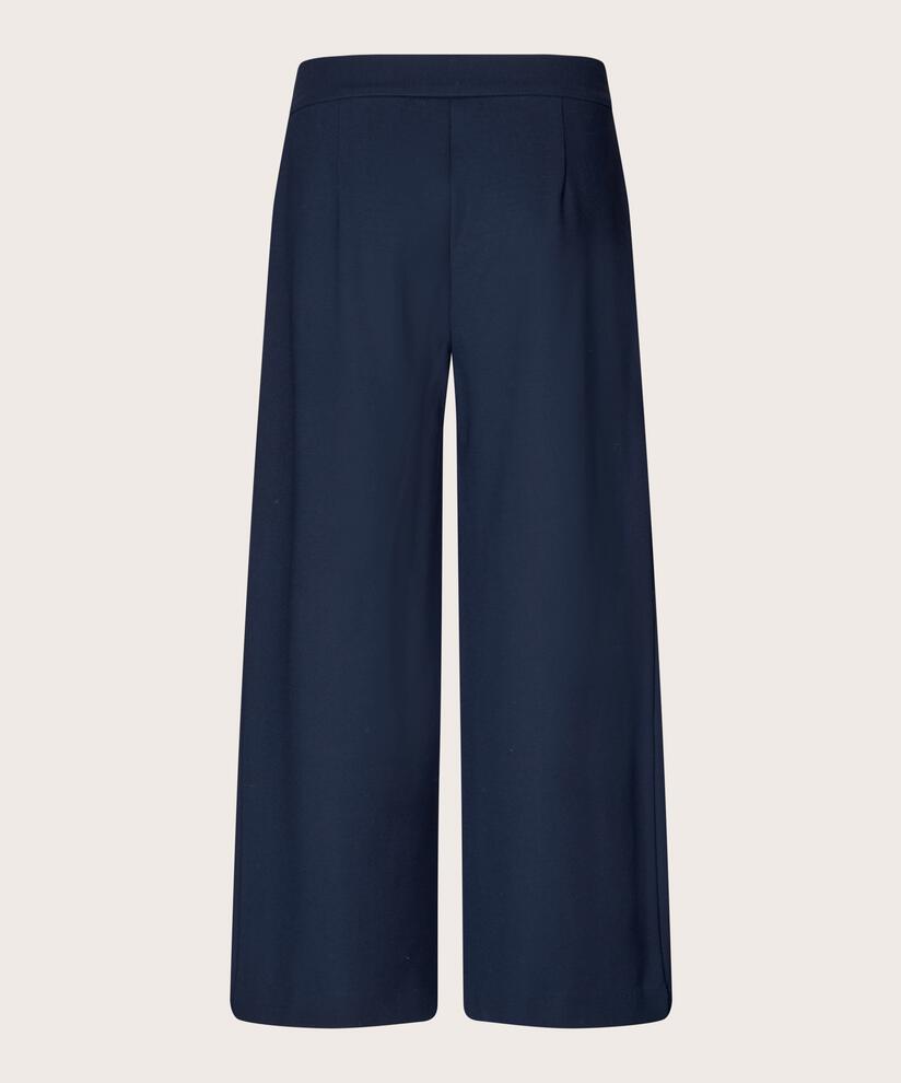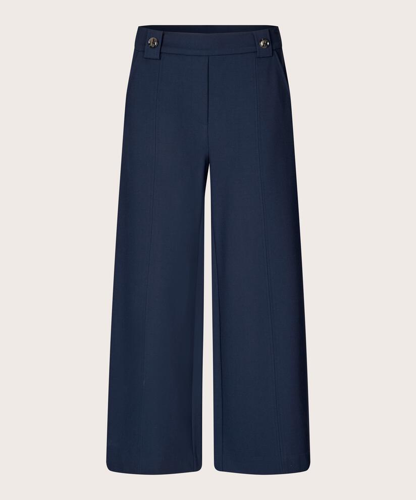 Vild KørvelDisse mørkeblå jerseybukser kombinerer komfort med klassisk elegance. De er syet i en kraftig, elastisk jerseykvalitet, der giver en flot form og er skøn at have på hele dagen. De dekorative knapper i taljen tilfører et stilrent, maritimt twist, mens den afkortede længde og brede ben giver et moderne og luftigt udtryk. Bukserne har desuden diskrete stiklommer i siderne og elastik i taljen for ekstra komfort. Style dem med en stribet top eller en blød strik for et ubesværet, chikt look.