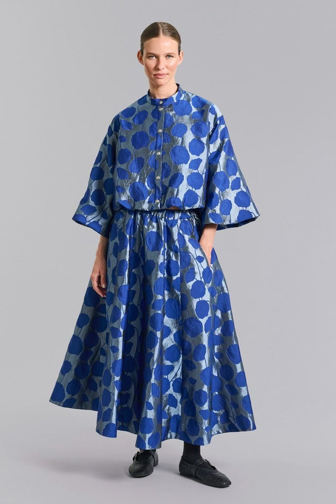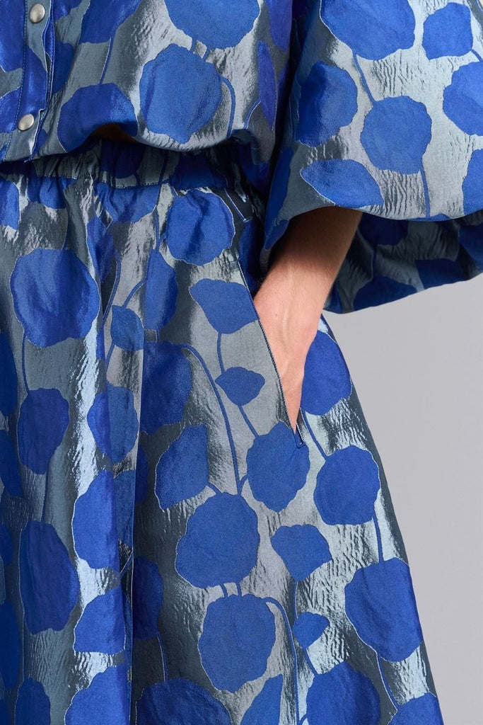 Vild KørvelNederdel i det smukkeste, shiny jacquard stof forsynet med grafiske blomsterranker. Stoffet er relativt kraftigt og giver en fantastisk volumen til nederdelen. En nederdel, der vil gøre hverdagen festlig og festen ekstra elegant.