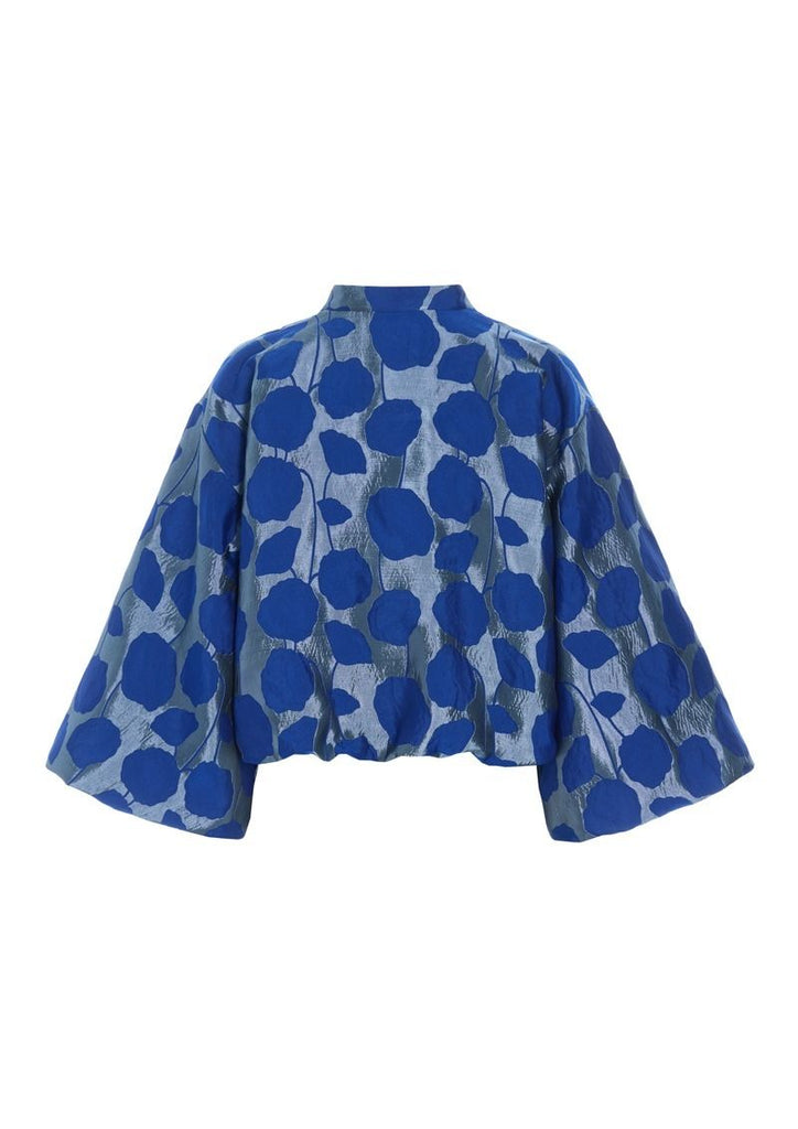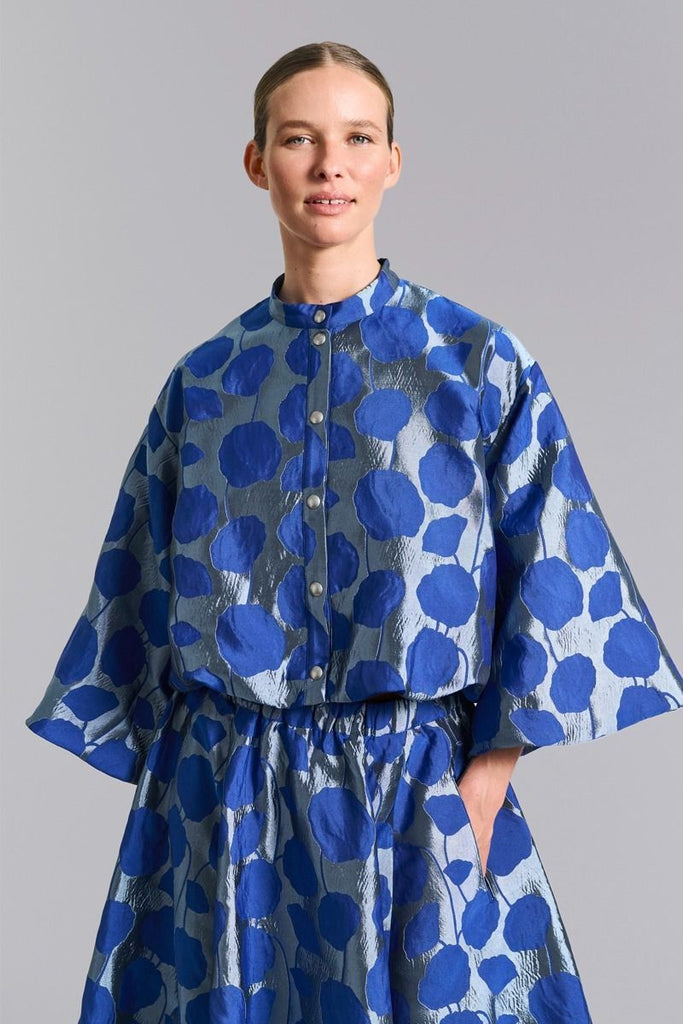 Kort jakke med flotte, voluminøse ærmer. Jakken er i det smukkeste, shiny jacquard stof forsynet med grafiske blomsterranker. Stoffet er relativt kraftigt og giver en fantastisk volumen til jakken. En jakke, der vil gøre hverdagen festlig og festen ekstra elegant.