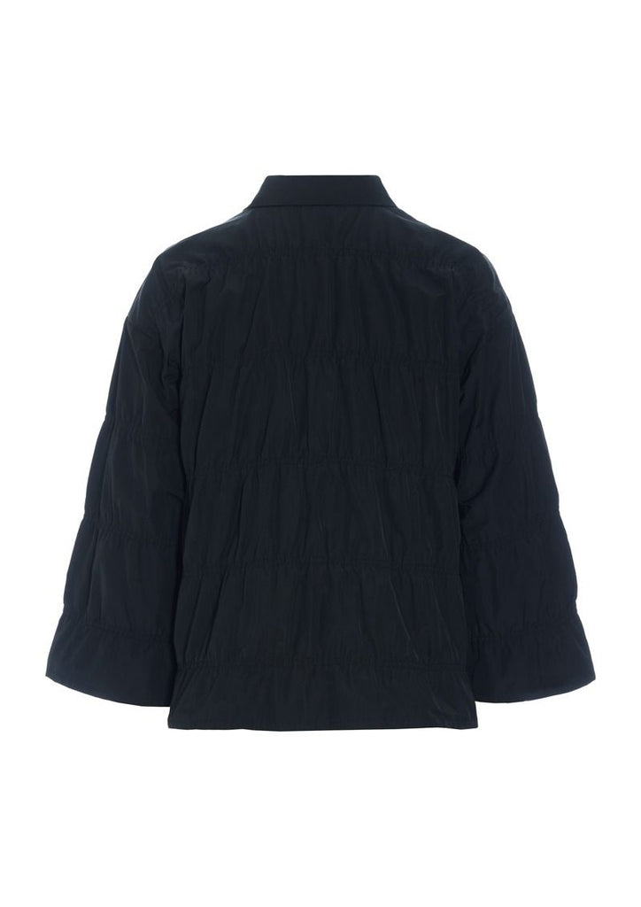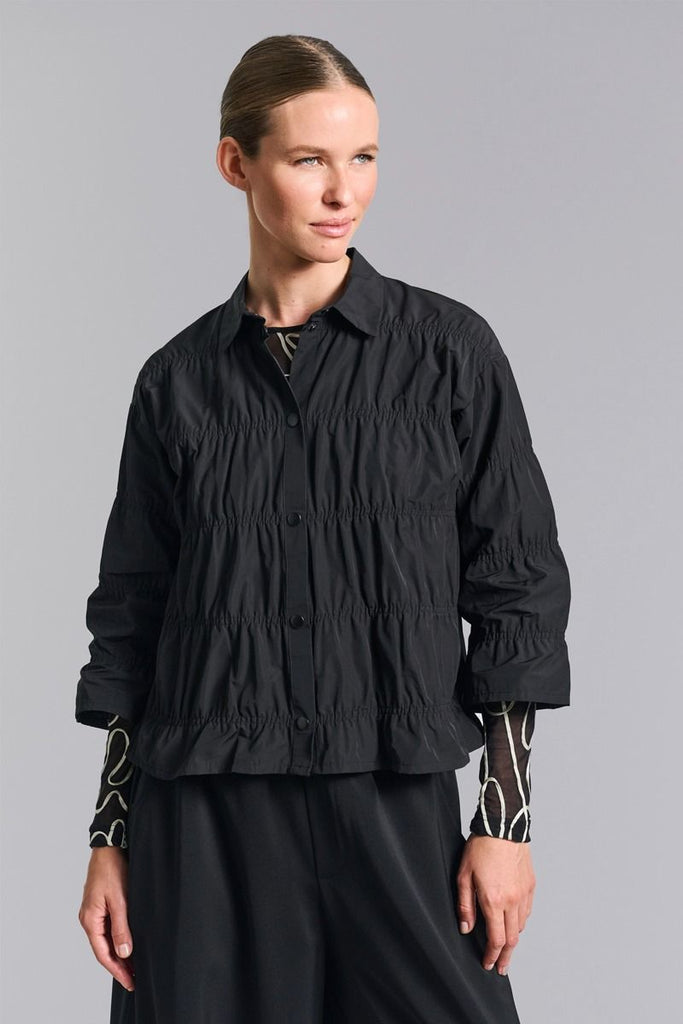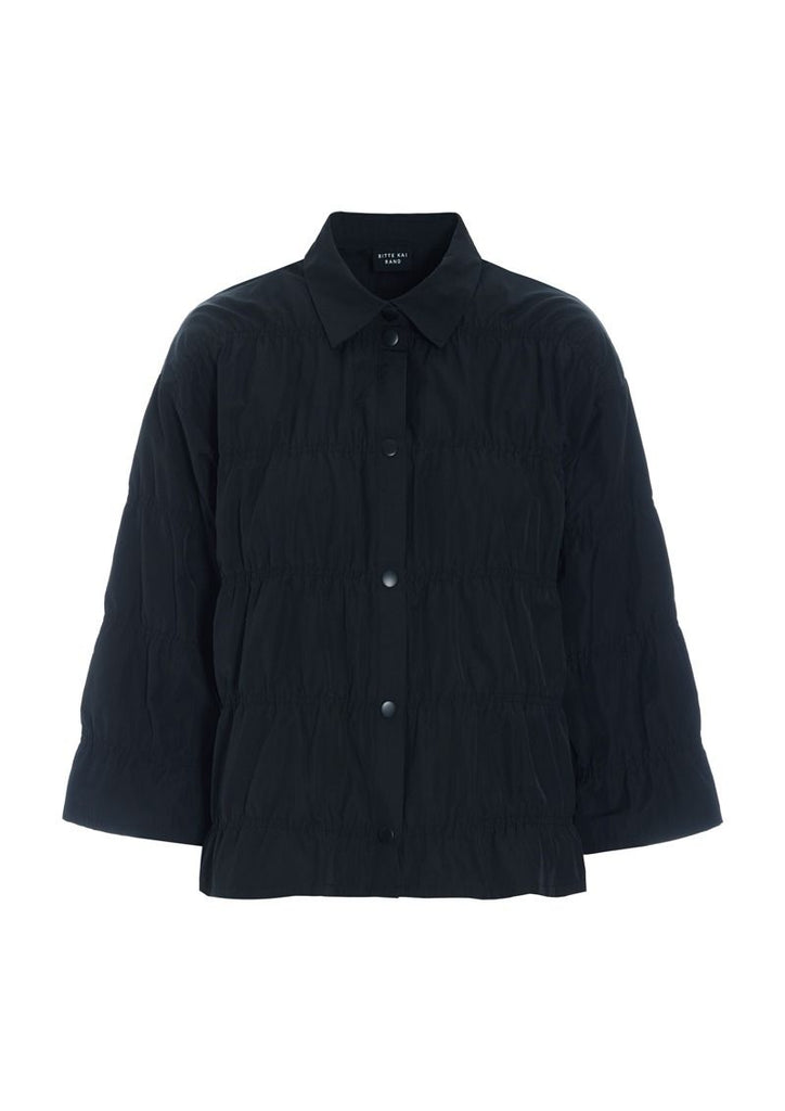 Vild KørvelJakke i en knitrende bomuldskvalitet med tværgående elastiske syninger, der skaber en flot rynkeeffekt og giver jakken et festligt og elegant udtryk. En jakke, der vil opgradere enhver underdel. Brug den lukket eller åbentstående, og lad en kropsnær bluse titte frem ved de 3/4-lange ærmer.