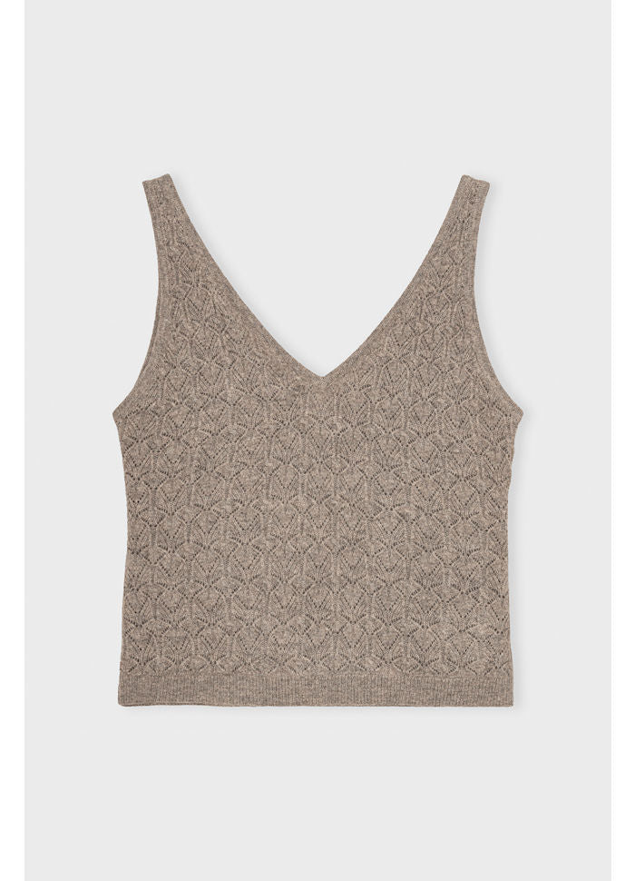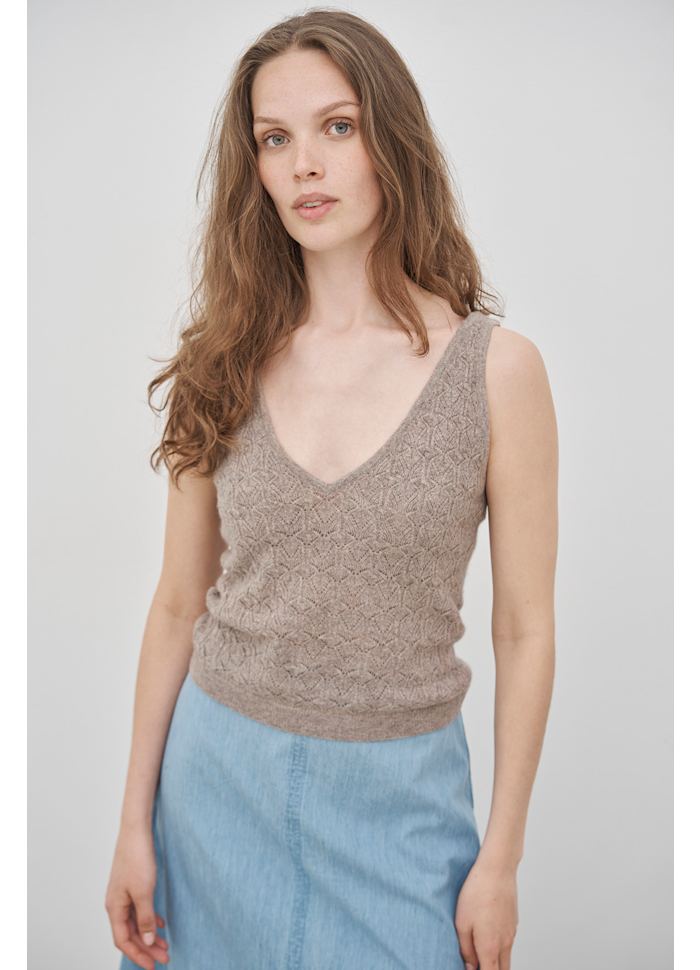 Aja-toppen skiller sig ud med en markant V-udskæring både foran og bagpå. Denne stil er let cropped og har en klassisk pasform.