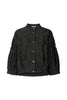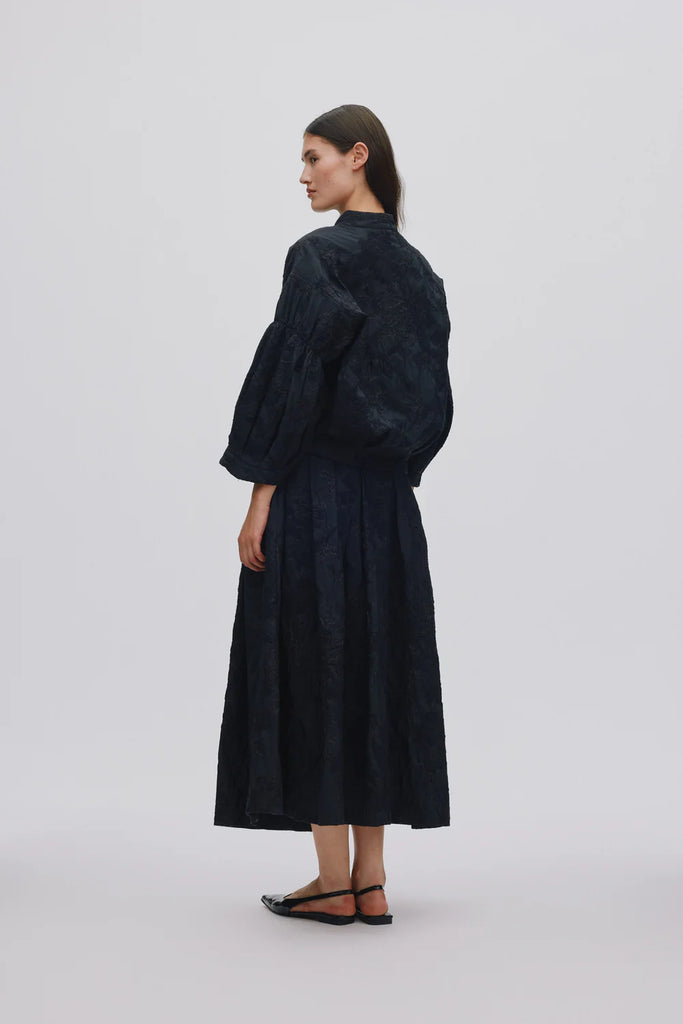 Designet har en flatterende silhuet med croppede ærmer, der skiller sig ud med volumen og rynkede detaljer. Den er detaljeret med en klassisk skjortekrave og knaplukning foran.
