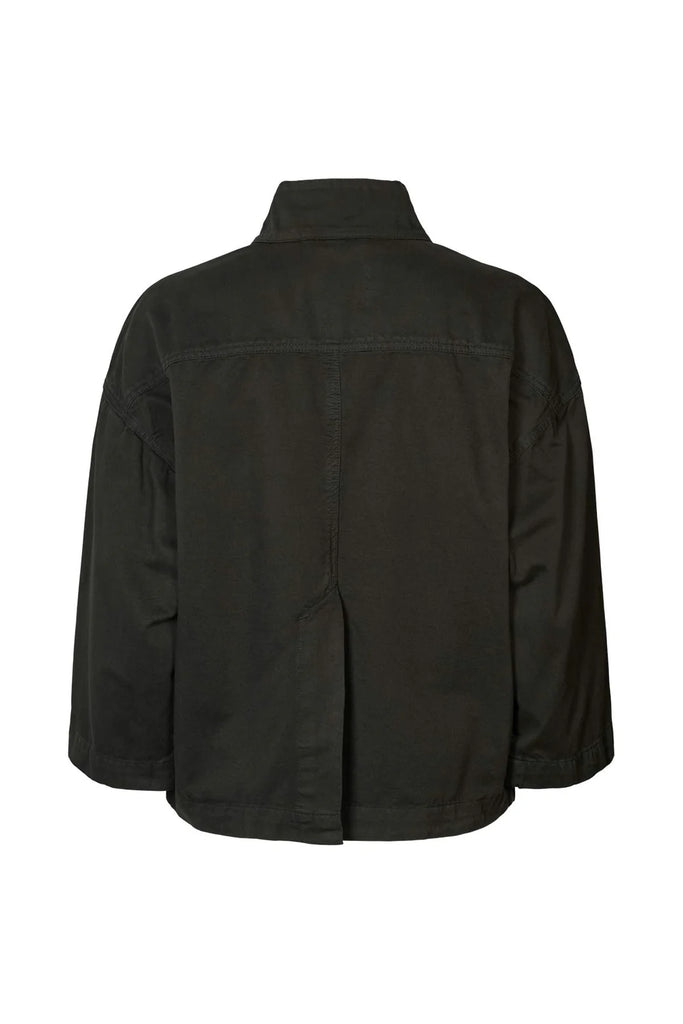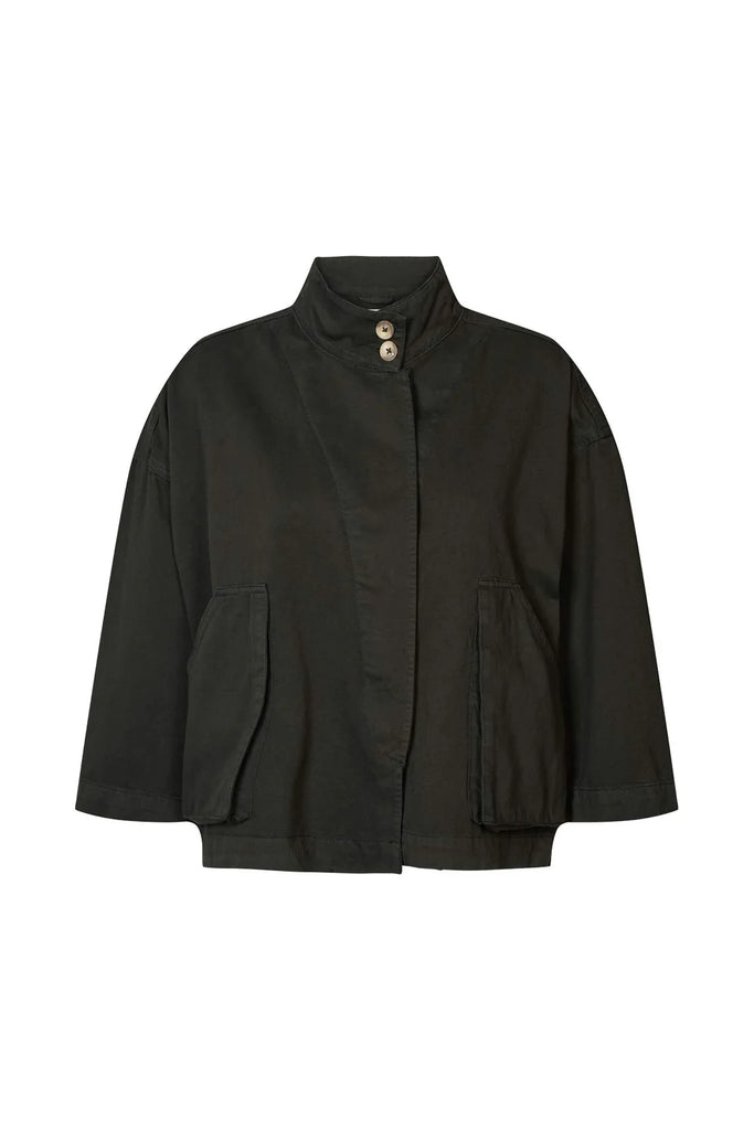 Jakken er lavet i en kraftig bomuldskvalitet, der sidder flot på kroppen. Designet er karakteriseret af en kort, boxy silhuet detaljeret med knaplukning foran, høj hals, croppede, løstsiddende ærmer og store frontlommer.