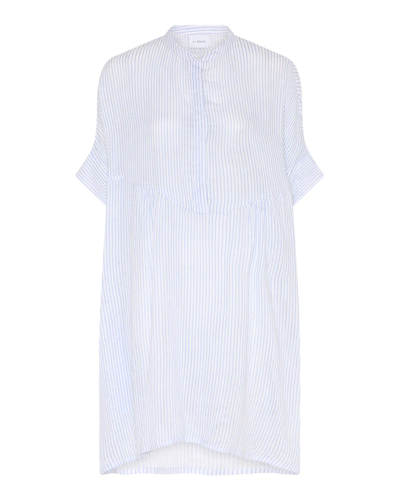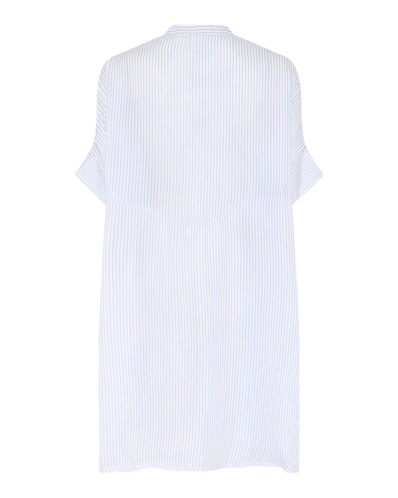 Vild KørvelGhita Tunic er syet i 100% let bomuld med et klassisk blåstribet mønster – et uundværligt valg til sommerens lune dage. Tunikaen har en flatterende længde, kinakrave og stolpelukning fortil, kombineret med kortere, dækkende ærmer for et sofistikeret udtryk. En diskret overskæring under brystet skaber en fin silhuet og giver et elegant brud på striberne i den rummelige pasform. En let og luftig favorit, der fungerer både alene og over bukser eller leggings.