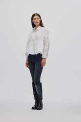 Vild KørvelDenne poplinskjorte har en feminin silhuet karakteriseret af en rynket detalje under brystet, der giver skjorten et puffet look. Designet er detaljeret med knaplukning foran, klassisk krave og lange ærmer med manchetter med knapper.