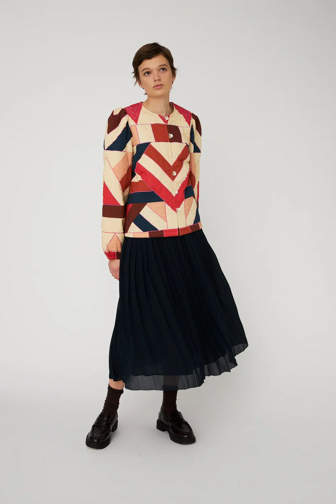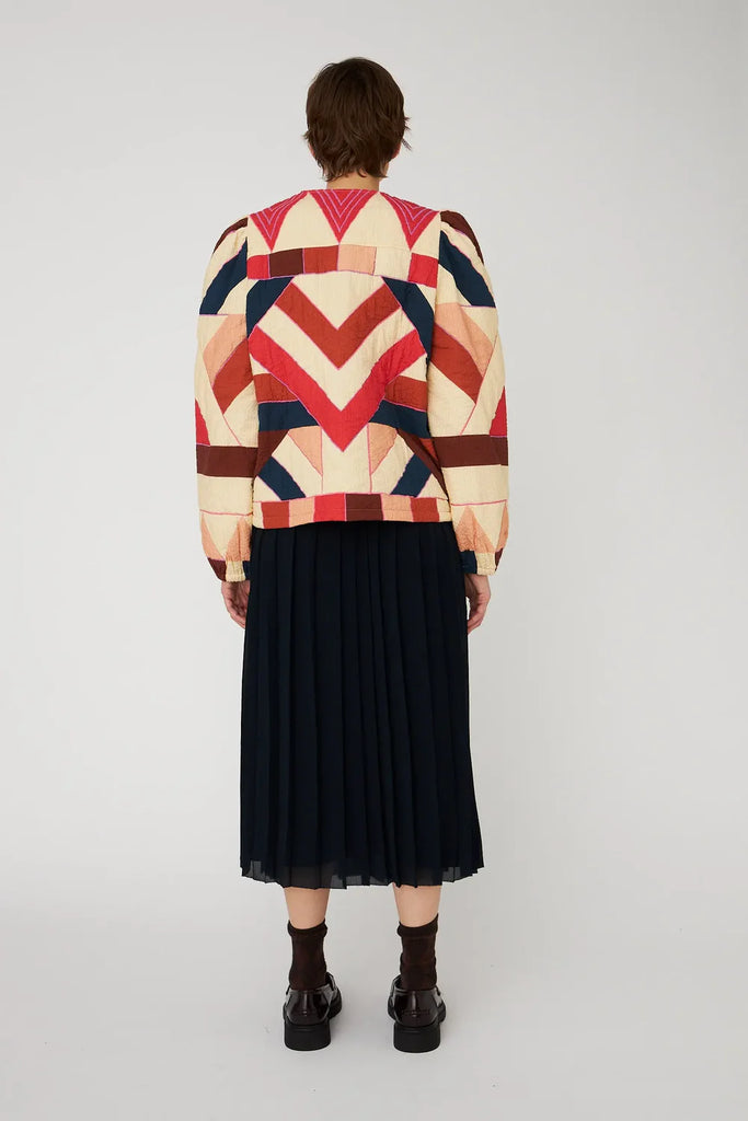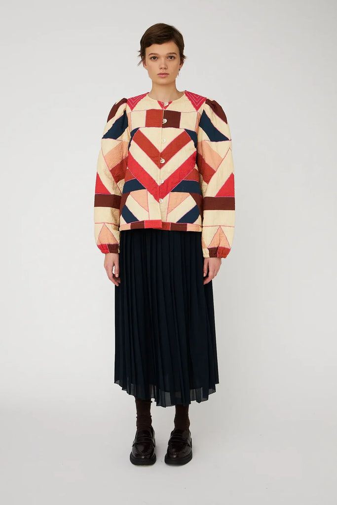 Midikjole med mønster inspireret af geometri. Quiltet jakke med mønster inspireret af geometri. Jakken har lange, voluminøse ærmer, elastiske manchetter og en rund hals. Jakken har knapper og sidelommer.