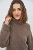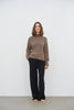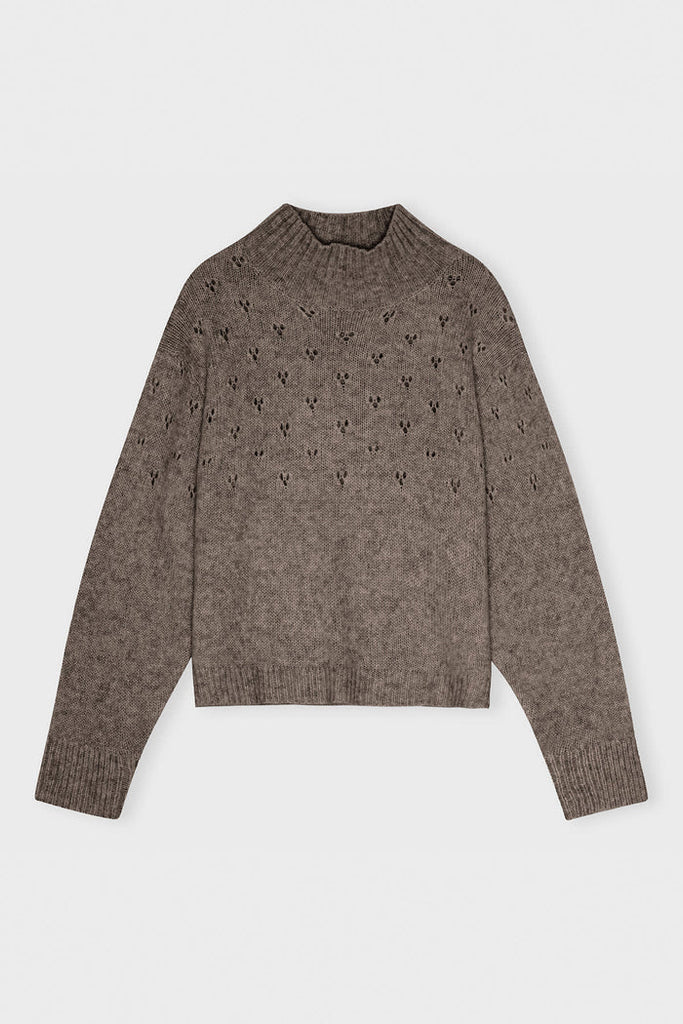 Sweateren har et smukt, feminint mønster, høj hals, lange ærmer og ribkanter.