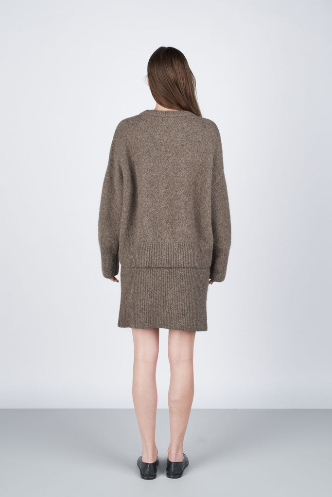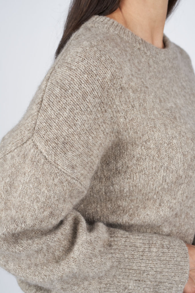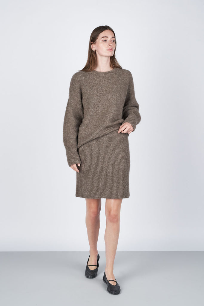 Vild KørvelEn klassiker til gardeorben. Dima er med rundhals, afsluttet med ribkanter og har et fluffy look. Den er fremstillet i vores nye alpaca/yak blend, der er fuldstændig fantastisk blødt og lækkert at have på. Du kan matche Dima sweater med Darla skirt for at opnå det look som modellen på billedet har på.