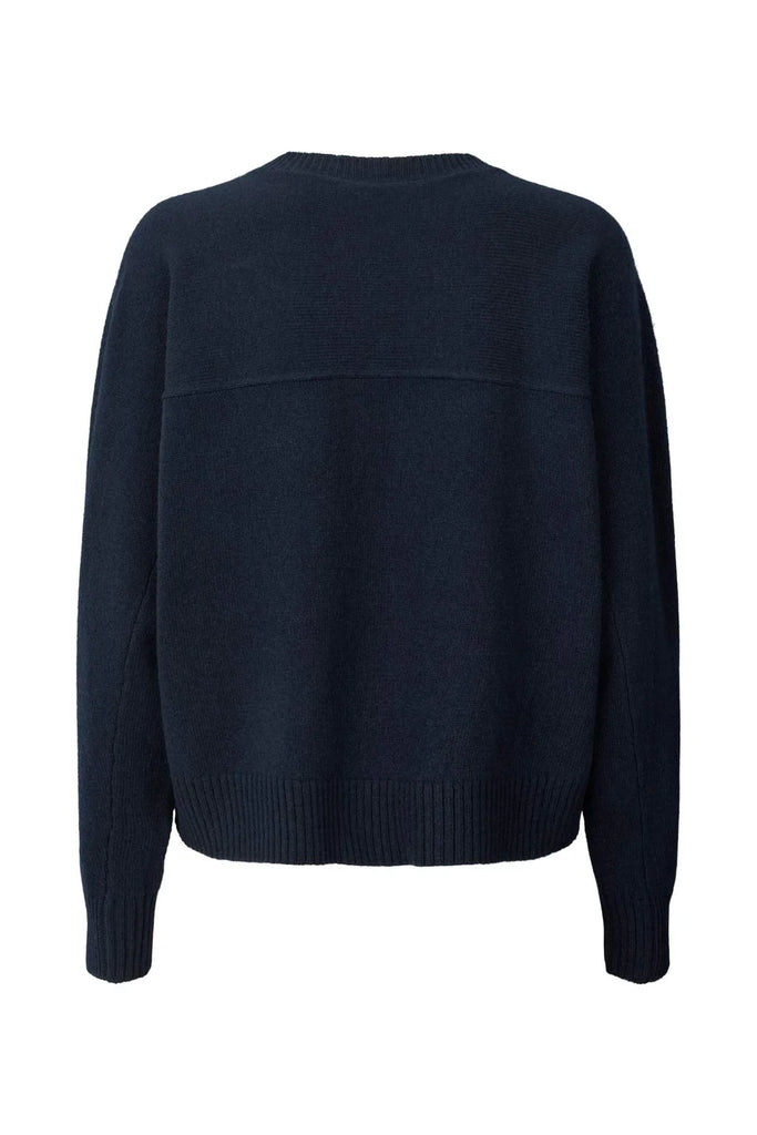 Den feminine silhuet defineres af en rund, ribstrikket hals og en boxy pasform med ribkanter ved ærmer og søm.