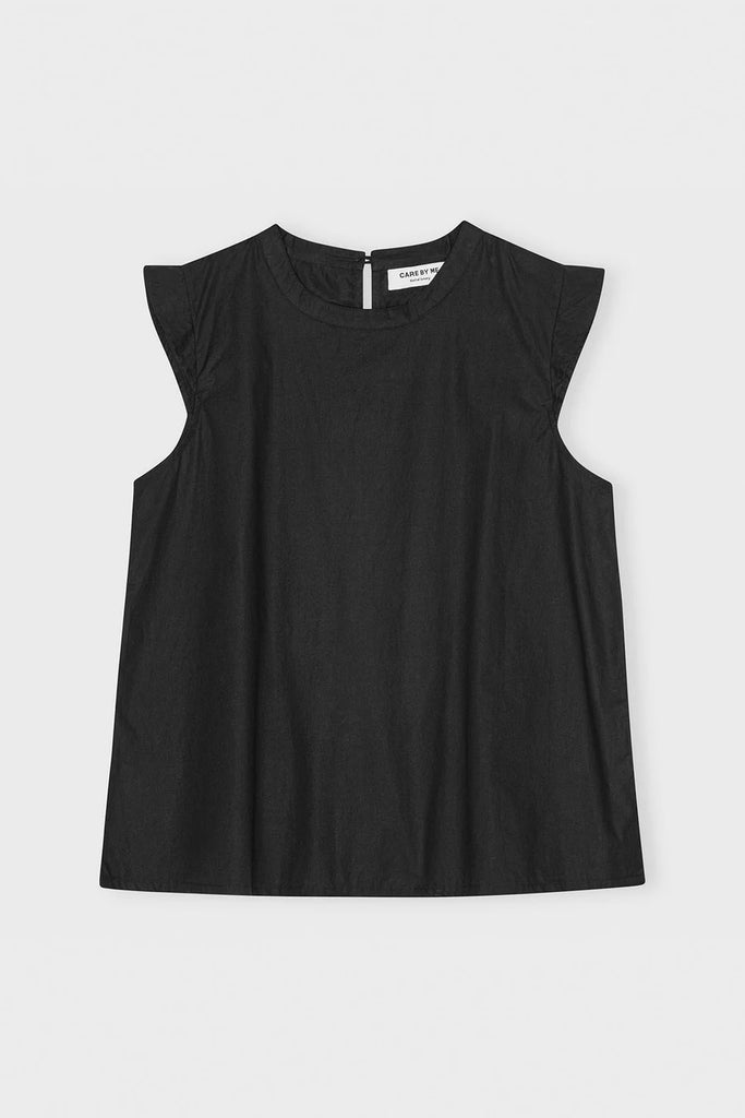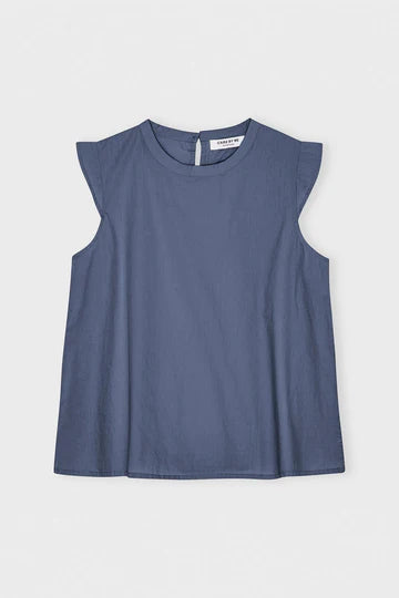 Toppen er fremstillet i let økologisk bomulds-poplin, har elegante skulderdetaljer, en rund hals og en lille knaplukning bagpå.
