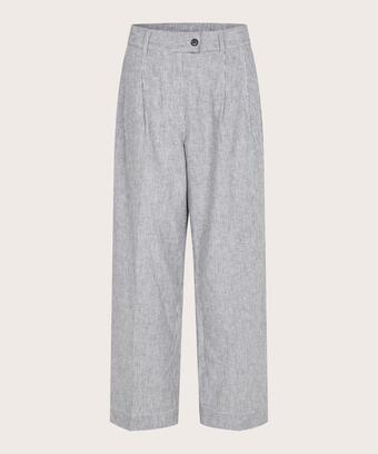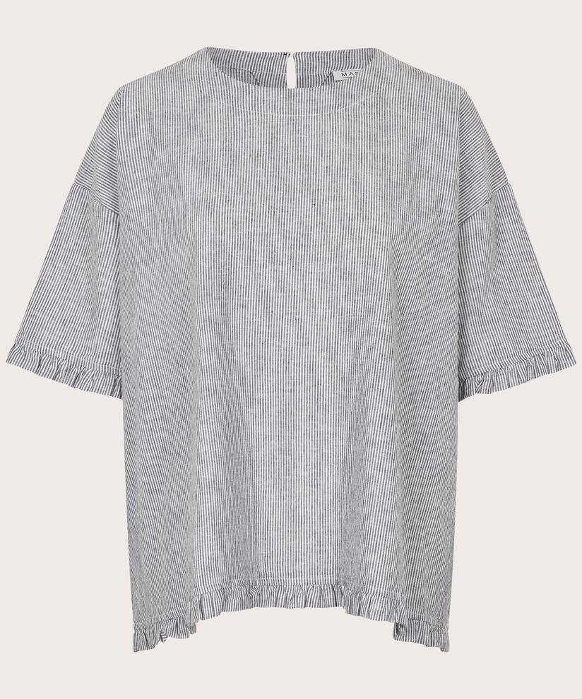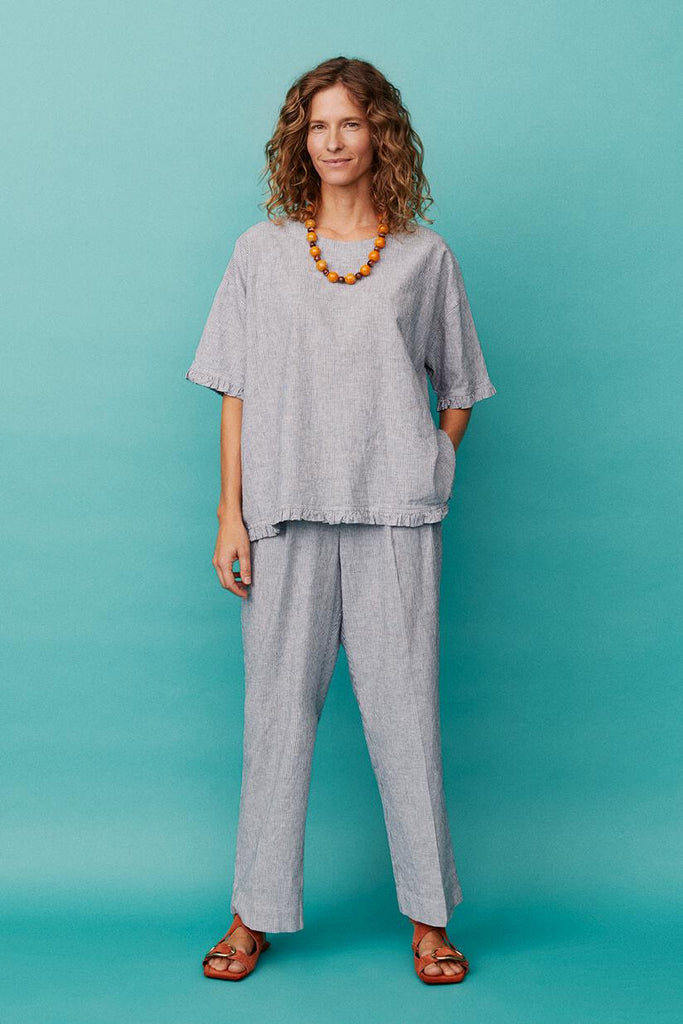 Vild KørvelMed sine fine, tynde striber i gråblå og hvid forener denne top afslappet luksus og elegance. Det bløde mix af bomuld og hør samt det oversize snit giver en behagelig pasform og masser af bevægelsesfrihed. De feminine flæsedetaljer tilføjer et raffineret touch. Style toppen med de matchende bukser og en skulpturel halskæde for et ubesværet og sofistikeret feminint look.