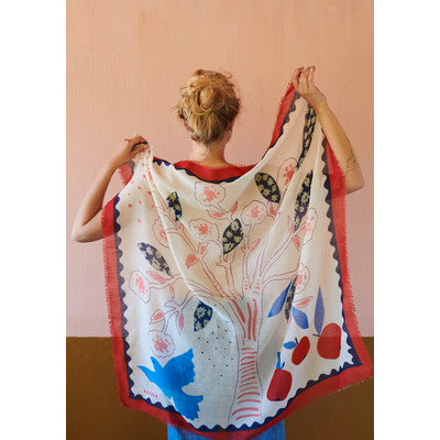 Vild KørvelBohemia tørklædet er et håndtegnet signaturtørklæde i smukke farver, trykt på en meget blød og eksklusiv uldkvalitet med rå kanter.