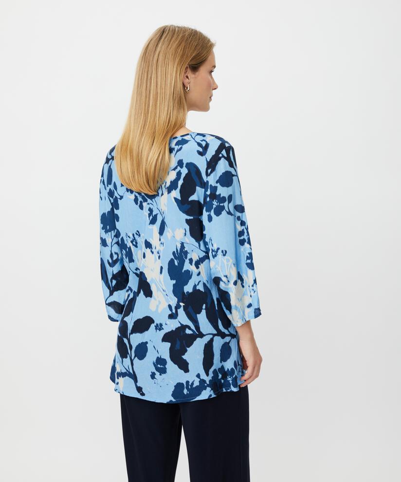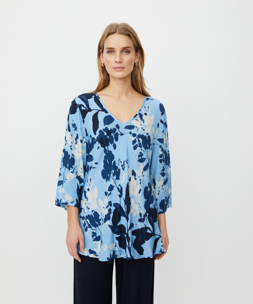 Vild KørvelDet smukke blomsterprint i blå nuancer kombineret med den lette viskose gør denne top til et sikkert valg, når du vil skabe et personligt og feminint look. Toppen er skåret i vores populære bias-snit, hvor det skrå snit får stoffet til at smyge sig blødt om kroppen og skabe et naturligt elegant fald. Med sin feminine V-hals og trekvartlange ærmer er den perfekt til et ubemærket elegant hverdagslook – enkelt, flatterende og tidløst.